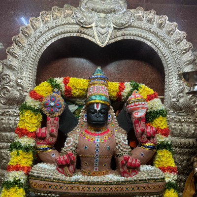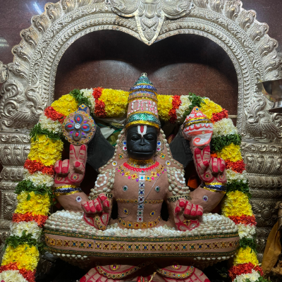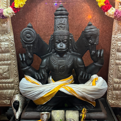 Sri Yoga Anjaneyar is found along with four hands (Chaturbujam) holding Sangu, Chakram, Jaba Mala and with Jaba Muthra in sitting posture (Yoga Pose). He is about 3 feet height sitting on the top of well and facing His ThiruMugam towards North direction. The Utsava Murthy is Sri Bhaktha Anjaneyar. Small Sannadhis for Sri Dhanvantri, Sri Hayagreevar and Sri Narasimhar are found on the walls of the Temple.